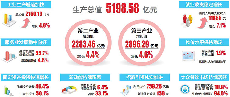 从市统计局召开的新闻发布会获悉,一季度,全市以新发展理念引领高质量发展,全市经济增速明显快于去年同期和去年全年,实现开门红。初步核算,并经国家统计局评估审定,一季度全市生产总值5198.58亿元,按可比价格计算,同比增长4.5%,比去年同期和去年全年分别加快2.6个和0.9个百分点。其中,第二产业增加值2283.46亿元,增长4.4%;第三产业增加值2896.29亿元,增长4.6%。