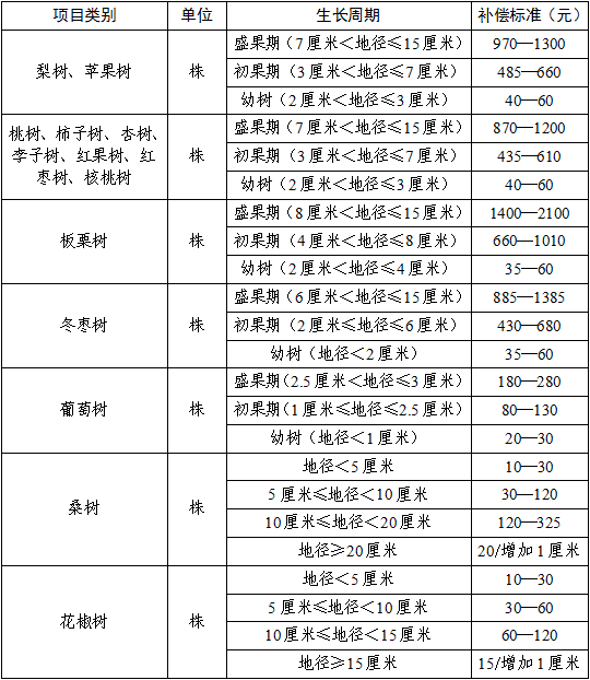 (一)果树补偿以果树的生长周期分幼树、初果期、盛果期三个阶段进行,辅以地径进行认定。